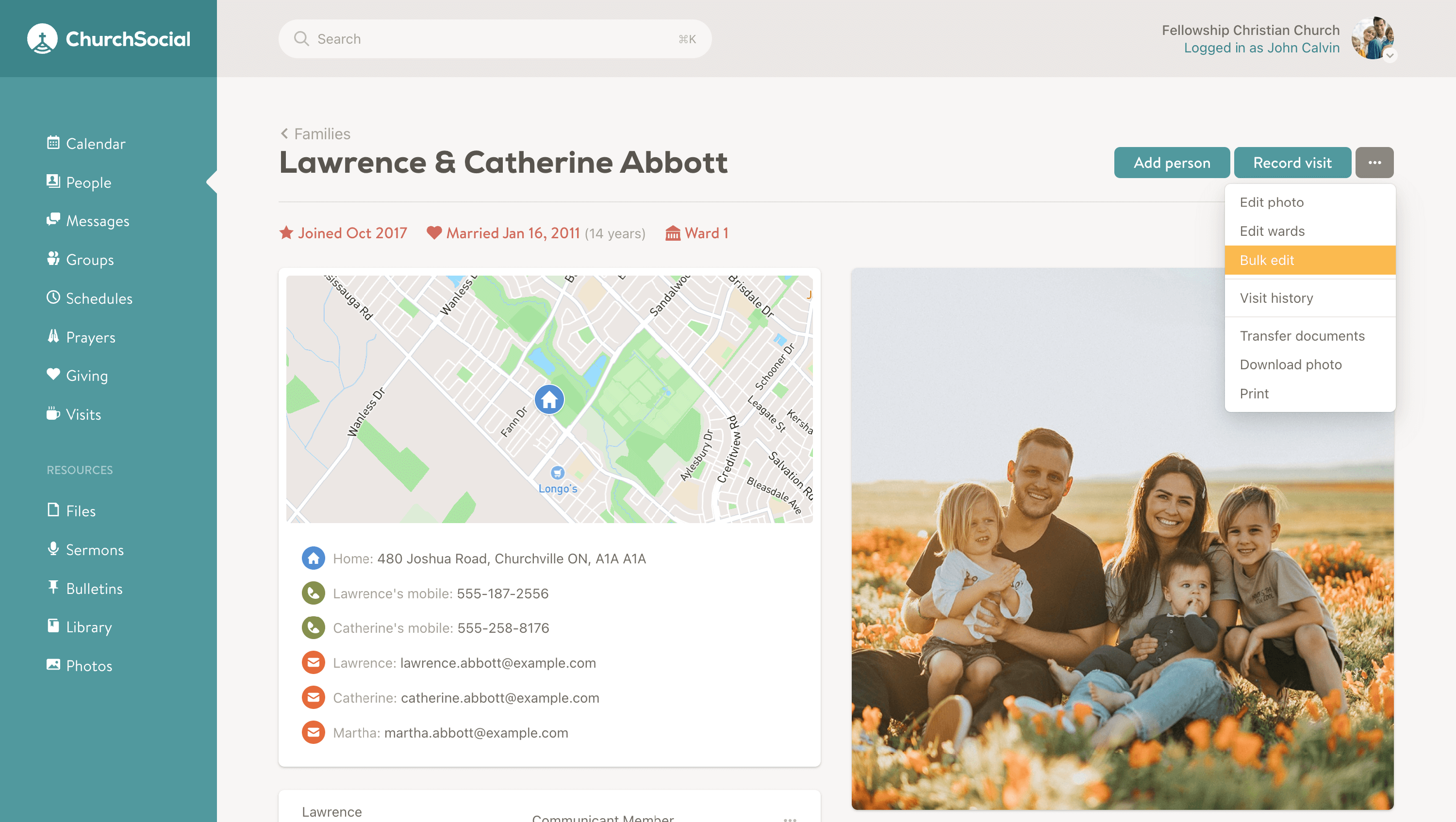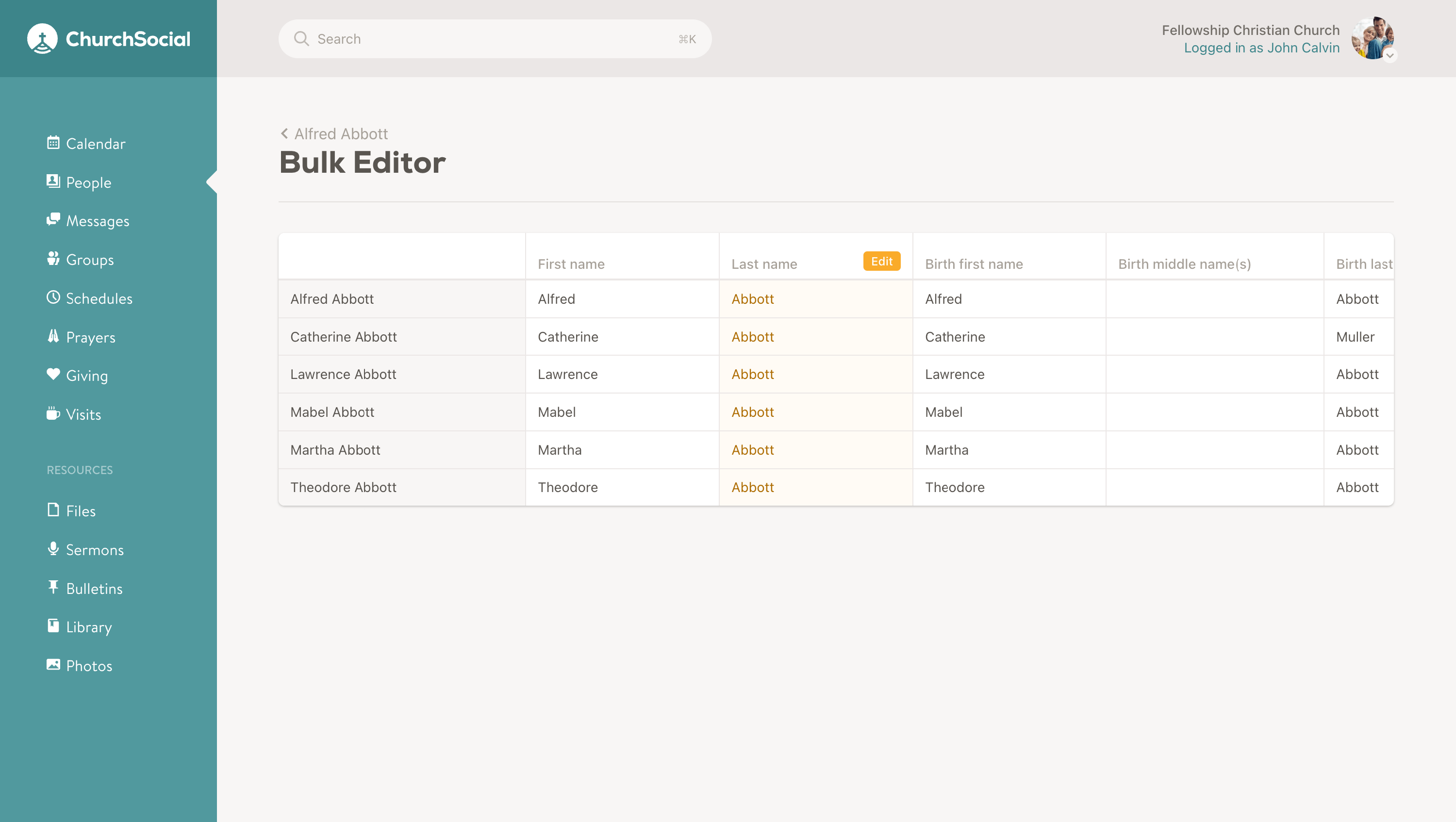 The bulk editor allows administrators to quickly update member data in bulk. It works like a spreadsheet, making it easy to compare information and spot inconsistencies. The bulk editor is available to both administrators and statisticians, and can be accessed from several places in the app, typically accessed from the People or Family page.