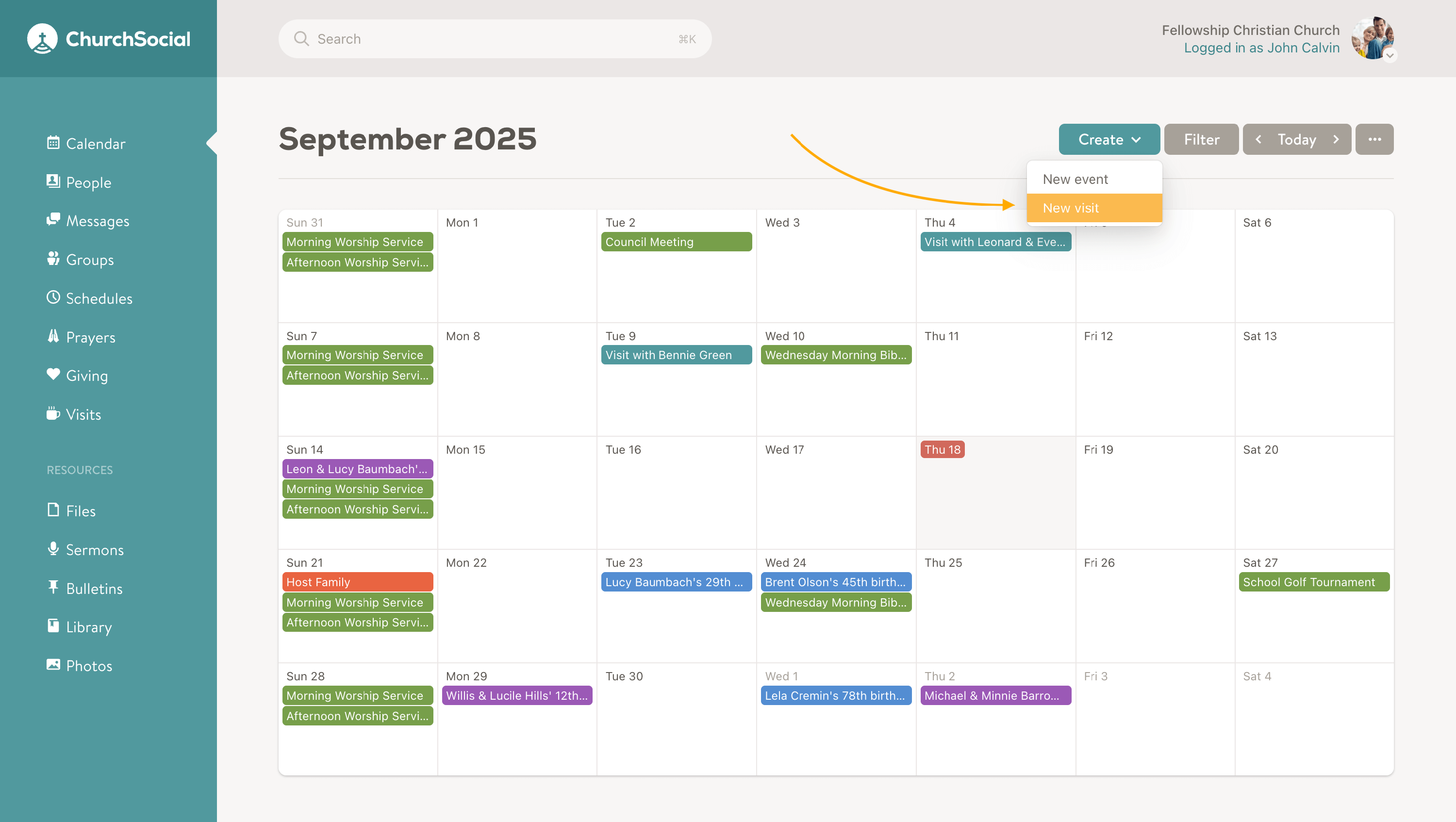 Note: If you don't see the New visit option, ask your Church Social administrator to enable the visit feature.