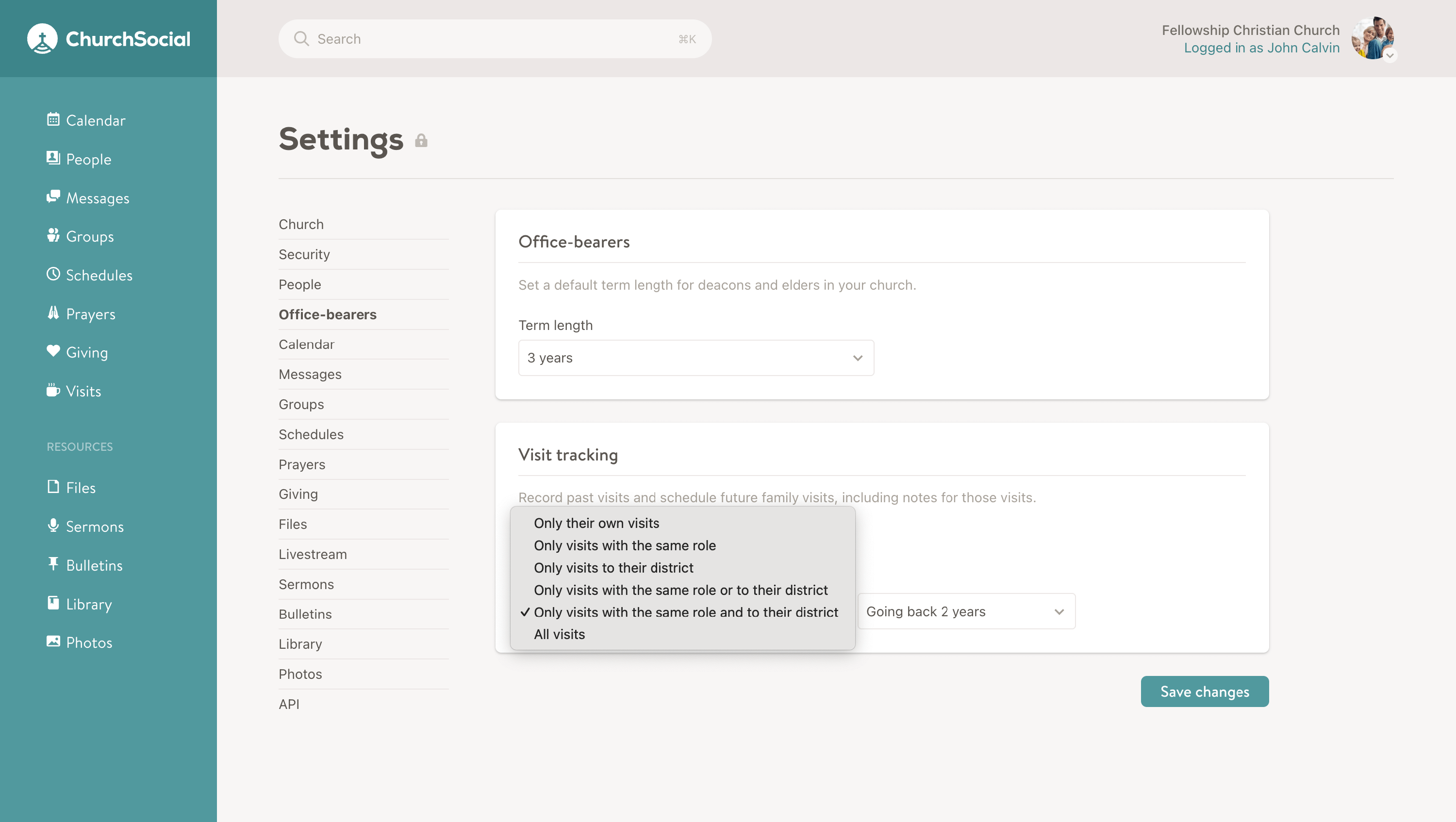 Church Social includes flexible privacy settings so that visits and notes are only visible to those who need access to them. By default, visibility for visit notes follows your church’s notes policy. This setting can be adjusted on the Office-bearer settings page by a Church Social administrator.