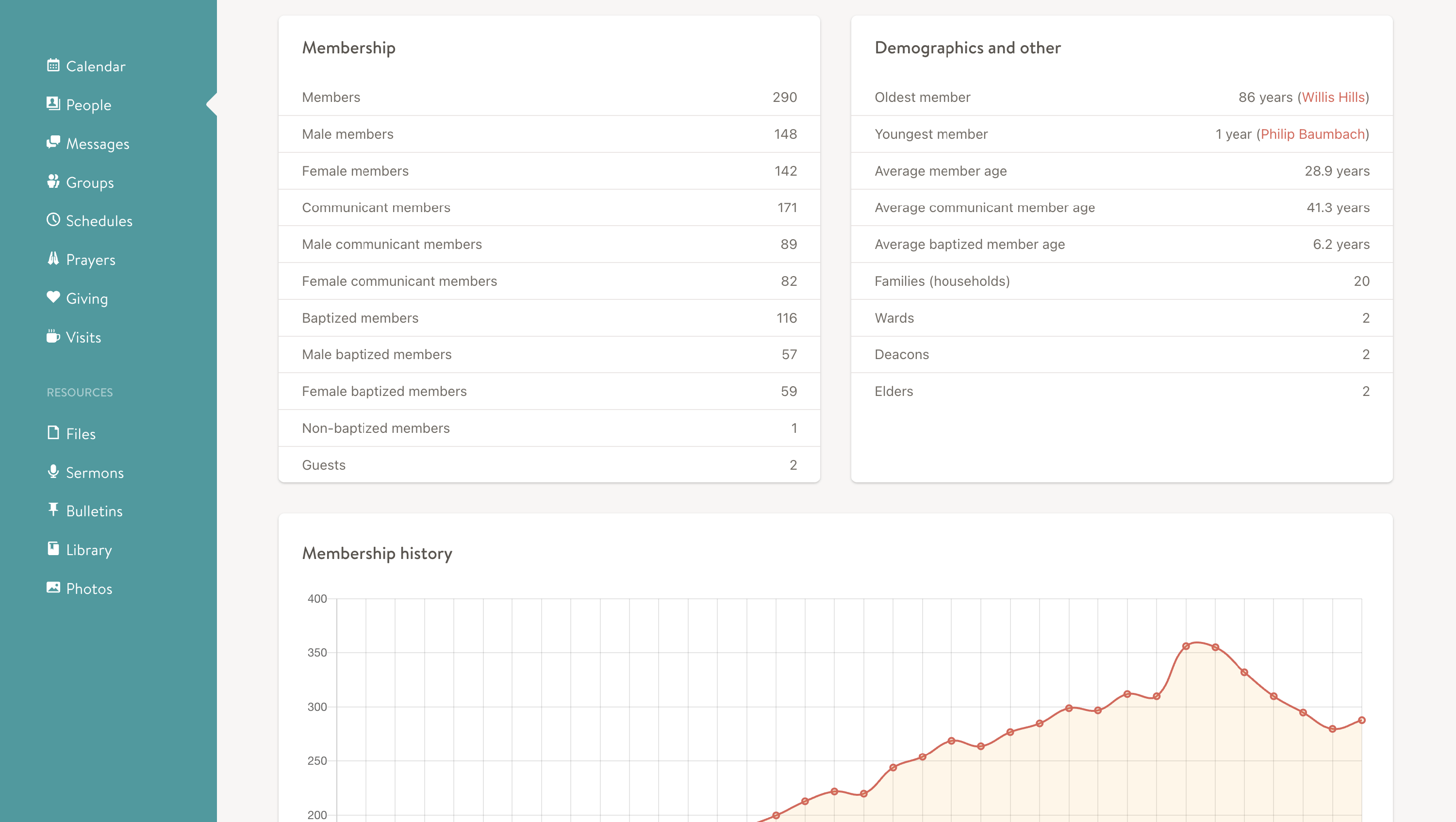 Church Social automatically generates the following membership statistics based on the member data you input.