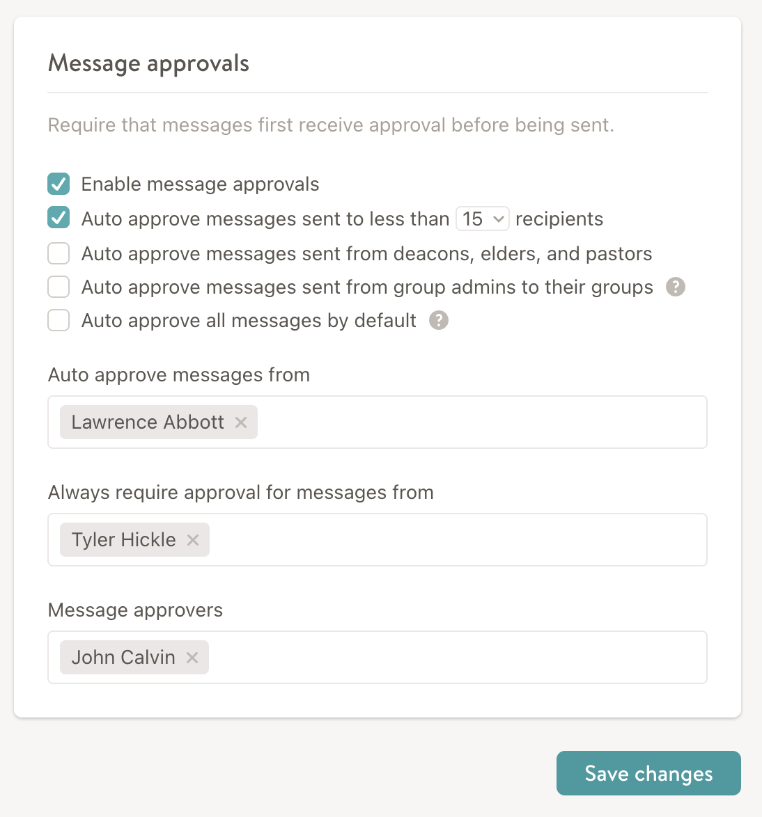 Your congregation can require that messages created in Church Social first receive approval from a message approver before they are actually sent. You can find this option on the message settings page under the "Message Approvals" heading.