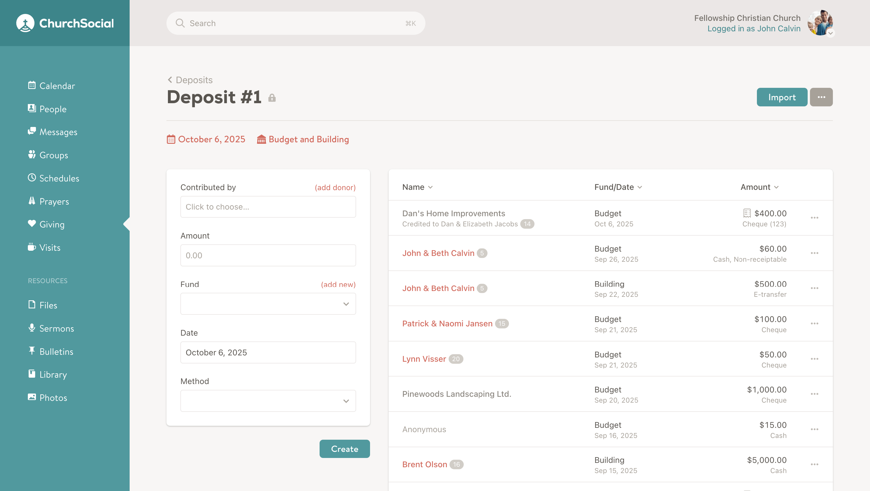 The deposit entry interface in Church Social has been carefully designed for quick entry, however it's also possible to bulk import contributions from an Excel or CSV file.