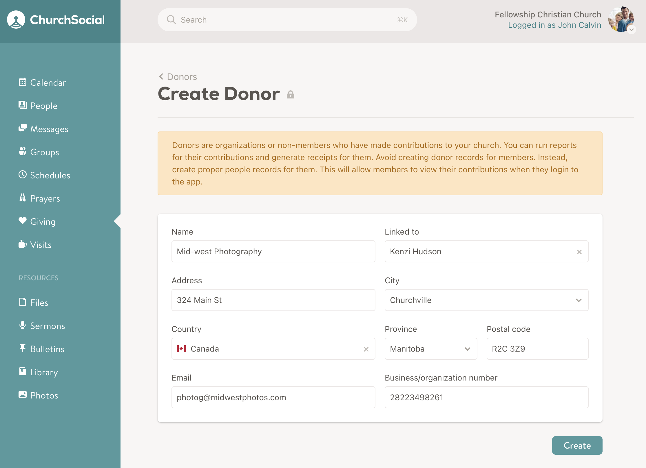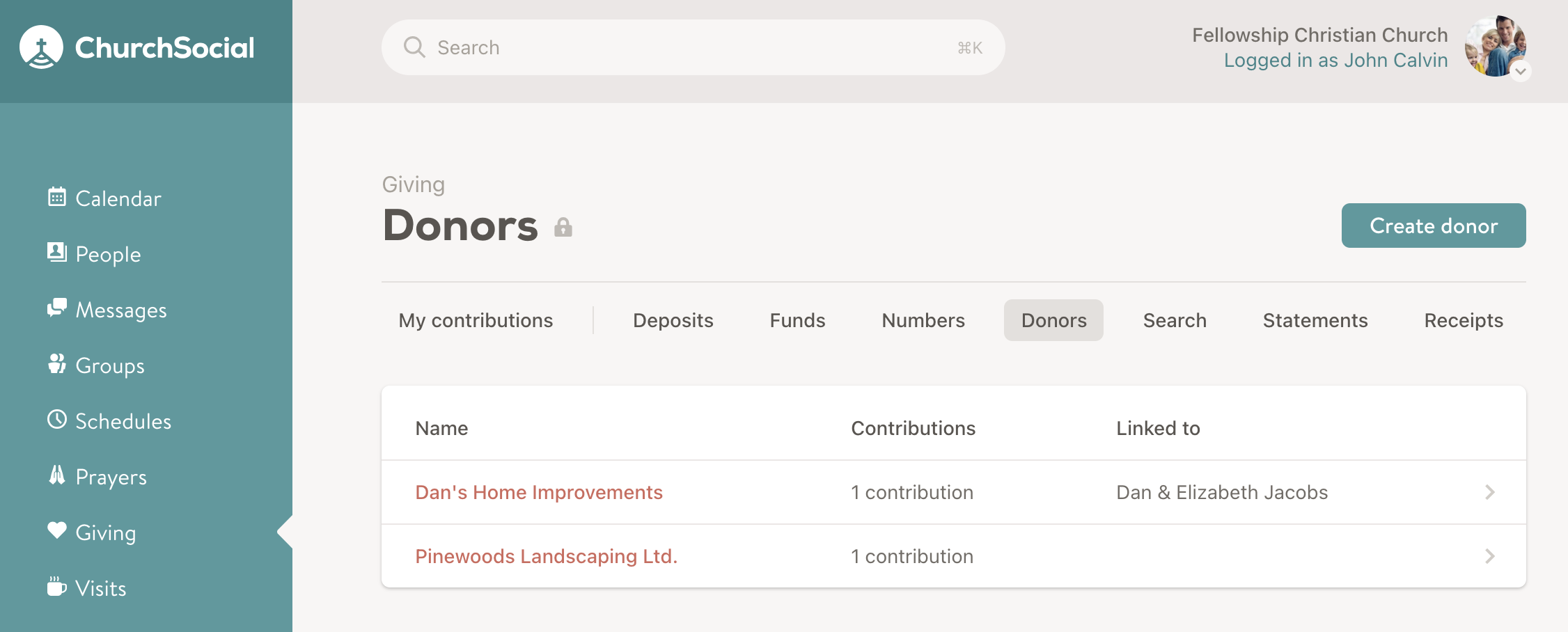 Financial contributions are assigned to either members or donors. Donors are any non-member entities who have made financial contributions to your church. This can include non-member individuals such as guests as well as organizations and businesses.