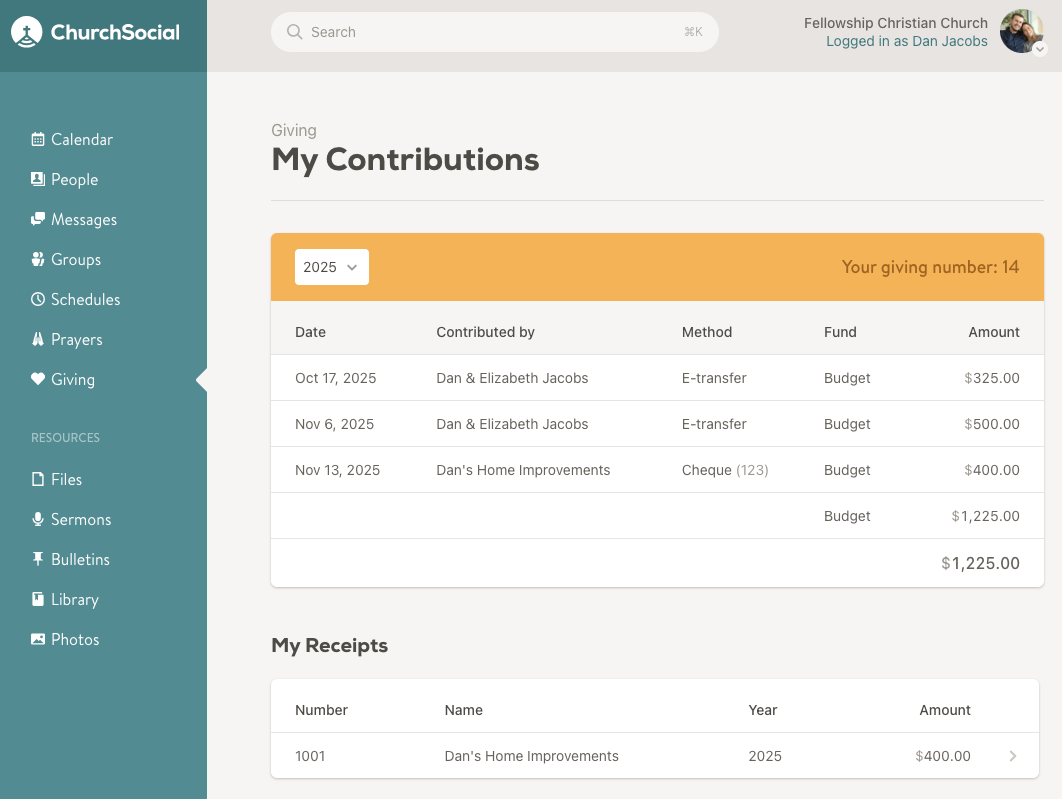This ensures that tax receipts are created for the business (the donor) and not the member. However, member statements and the member's My contribution page in Church Social will still include any contributions made via a business as you can see in the screenshot below.