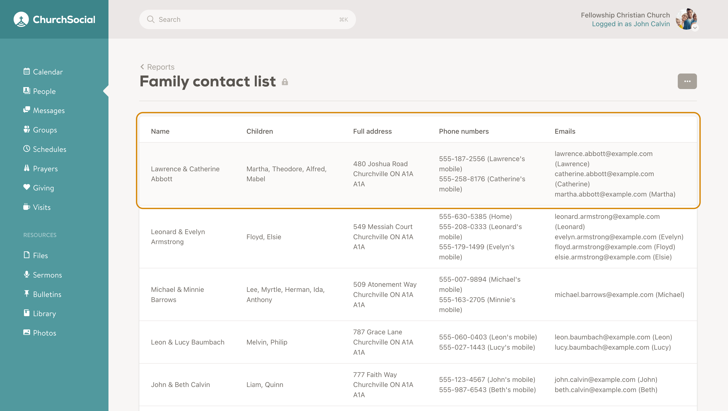 For example, the Family Contact List report shows all members of your congregation along with their children, address, phone numbers, and emails. If you notice an error, simply click the member’s name to open their profile and make the correction.