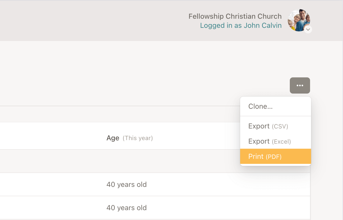 Built into Church Social is a powerful report builder that lets churches create almost any report from their membership data. Reports can be downloaded as PDF or exported to Excel/CSV files.