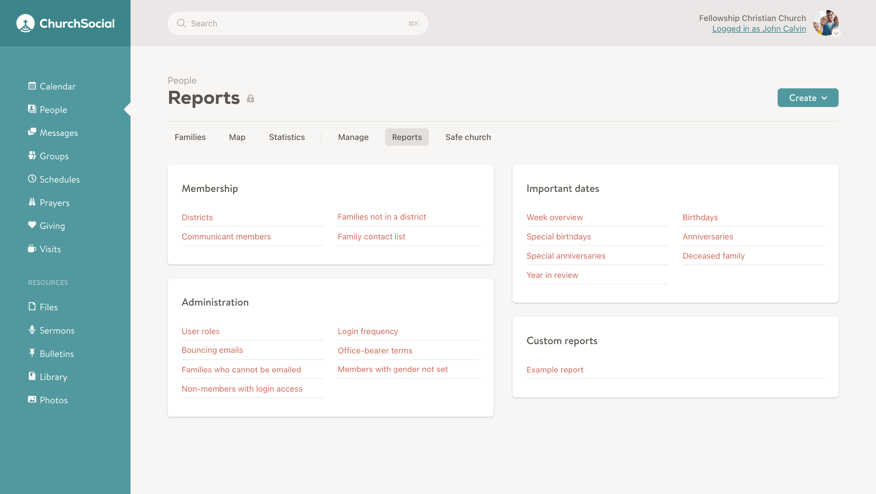 The first thing you’ll notice on the Reports page is a set of ready-to-use reports. Church Social comes with nearly 20 built-in reports and that number is growing! To make things easy to find, we’ve grouped them into categories: Membership, Administration, Important dates, and Custom reports.