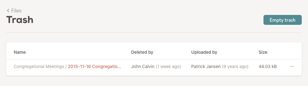 The trash feature acts as a safety net to protect files that are accidentally deleted. You can find the trash in the three-dot menu at the top right of the Files page. Files in the trash will only be visible to those who deleted the file and to those who have edit permissions for the folder that contained the file.