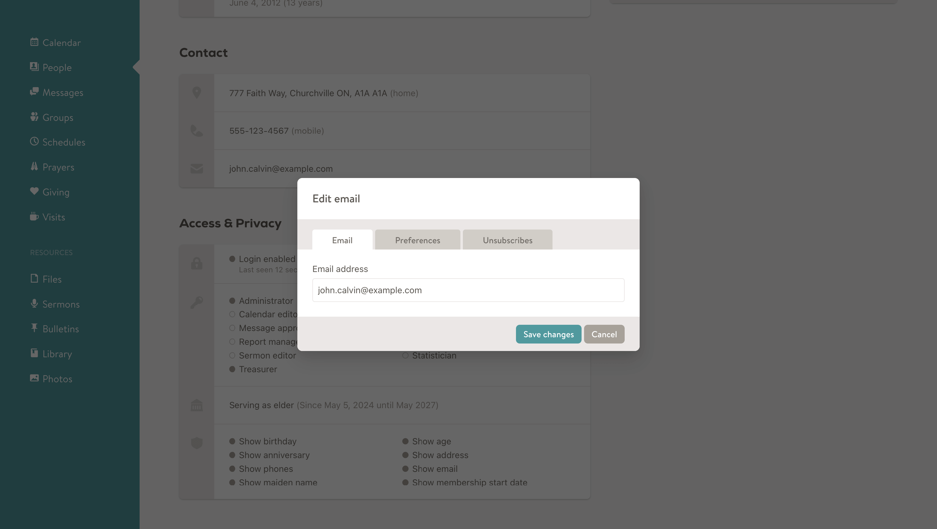 Emails are unique to each member and should not be shared across a family since they are used to log into the app and determine permissions. For example, an elder who may have access to private or sensitive information.