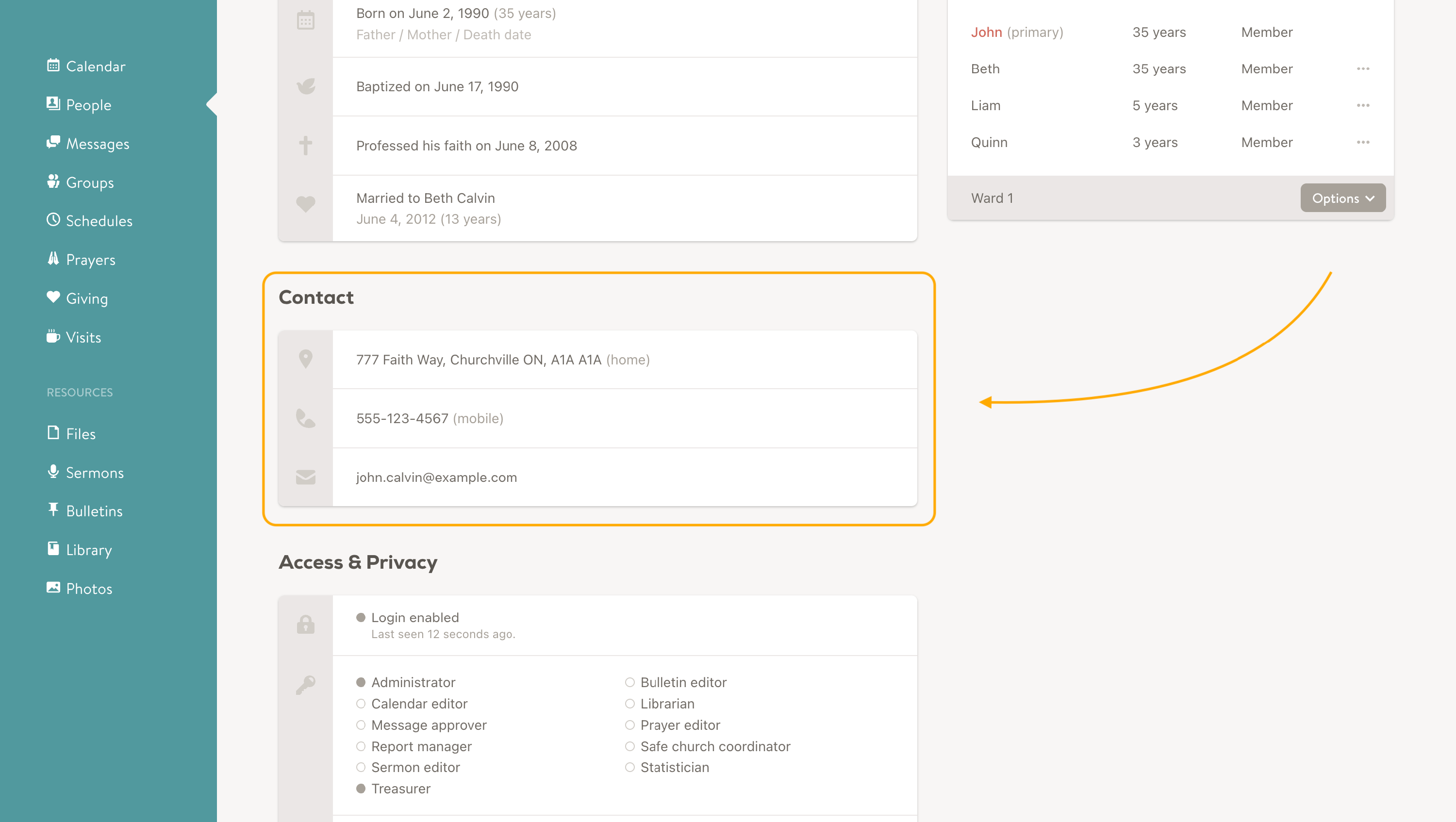 Contact information is generally stored on each individual member. However, some details—such as a home address or home phone—can be shared across the entire family.